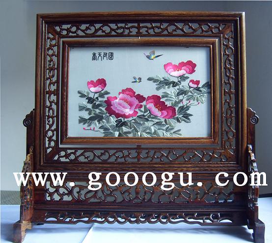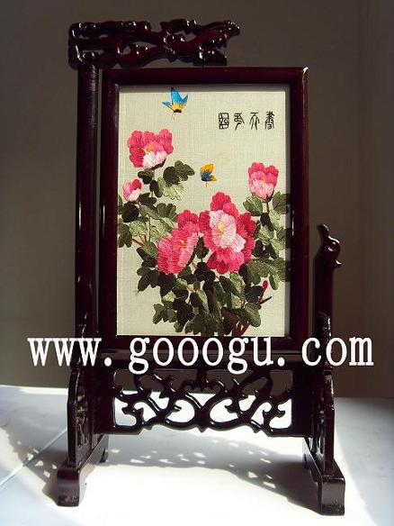 ?。ㄒ唬?span lang="EN-US"> 普通檔蘇州雙面繡:普通檔蘇州雙面繡以其圖案做工一般,框架材質(zhì)普通(多以菠蘿格為木質(zhì)),繡片做工多以一根粗線或一絨構(gòu)成。尺寸方面以小規(guī)格為主,常規(guī)尺寸為20圓厘米直徑,三十圓厘米直徑,14*20CM(畫心尺寸) 16*25CM(畫心尺寸),30CM圓直徑等。名稱民間稱法不一,筆者就此做簡單的介紹,如單龍頭架,雙龍頭架,同心圓等,。包裝方面目前以簡單禮盒裝為主(筆者認(rèn)為做為禮品還欠缺,有待改進(jìn))。目前以擺在桌面臺(tái)屏雙面繡為主。蘇繡圖案多以牡丹,花草,小動(dòng)物為主,目前整體圖案搭配創(chuàng)新方面不是太強(qiáng)。在國內(nèi)蘇繡市場(chǎng)普通檔蘇州雙面繡目前所占的比重比較大,普遍價(jià)格不高,出廠價(jià)一般在一百至兩百元左右。是目前很多企業(yè)采購的重點(diǎn)檔次選擇之一??勺鰹槠髽I(yè)商務(wù)禮品,會(huì)議禮品,紀(jì)念禮品。加上燙金工藝,是企業(yè)宣傳廣告的好載體之一。