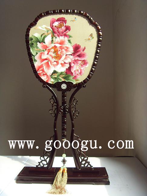 (三)高檔蘇州雙面繡:此款一般配以檀木木質(zhì),再配上寬厚的錦盒包裝。目前代表作是蘇州雙面繡紫檀宮扇,20CM直徑的臺(tái)屏,葫蘆扇等。此款的最大優(yōu)點(diǎn)是包裝精美,產(chǎn)品材質(zhì)高,繡片整體精良。但目前大多商家因?yàn)楸绕磧r(jià)格因素,偷工減料,以次充好,大大影響了整體品質(zhì)。圖案方面目前還欠缺嚴(yán)重創(chuàng)新。目前此款的出廠價(jià)在600元至2000元左右。