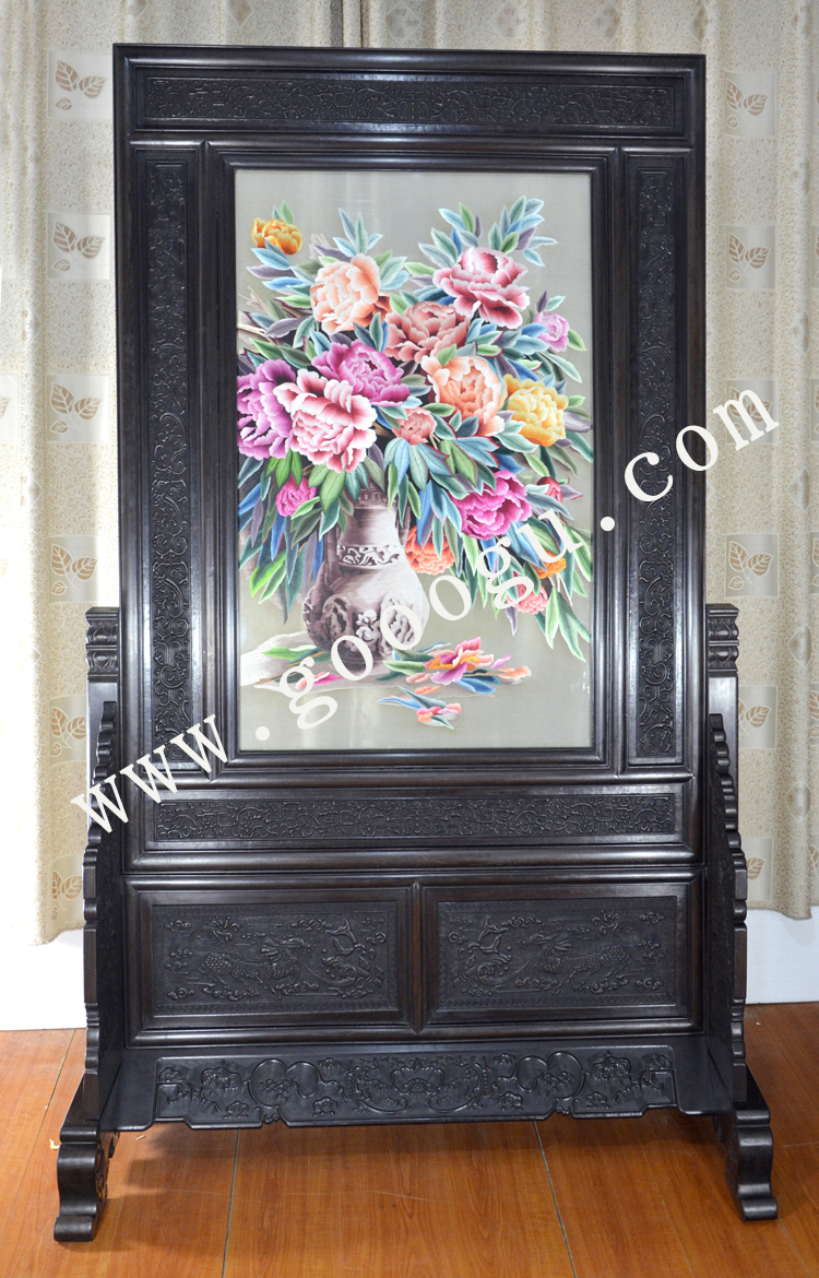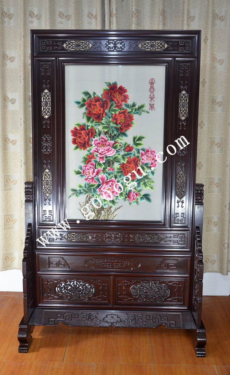 玄關家用屏風 雙面繡屏風 木質玄關 榮華富貴牡丹圖
