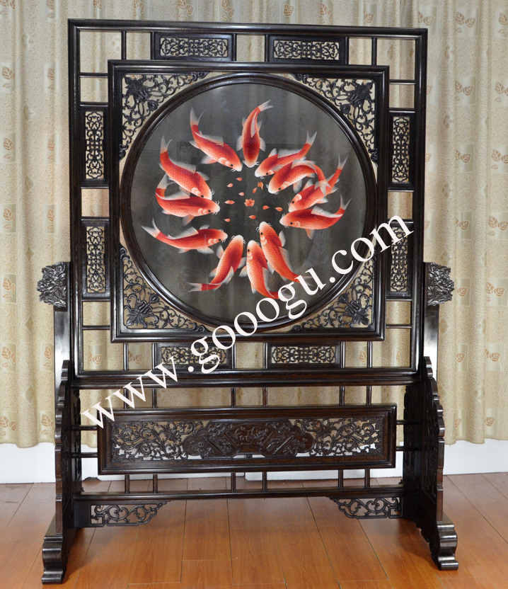 蘇繡屏風 雙面繡 高檔繡工 十二紅魚 雞翅木