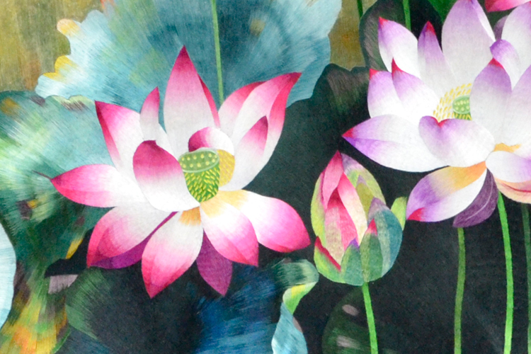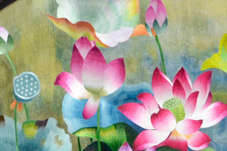 【產品名稱】:滿繡荷花屏風 (作品代碼:P-1098) 【產品規(guī)格】:圖案尺寸為100cm直徑的圓 外框整體尺寸寬160cm,高210cm 【產品工藝】:手工刺繡 【產品材質】:真絲面料+雞翅木框+桑蠶絲線+玻璃 【產品包裝】:木箱包裝,用海綿包扎,確保運輸安全 【出廠價】:36800元 【產品運輸】:我司負責發(fā)往客戶指定地點,蘇州附近城市可送貨上門! 【產品說明】:此款雙面繡屏風,是由蘇州工藝師耗時三個月精心手工刺繡而成,刺繡圖案以荷花為題材繡工精細,顏色搭配均勻過渡自然,整體給人舒適,愜意之感,屏風的框架選用雞翅木為料,是蘇繡屏風中的經典作品。是家用玄關或辦公室玄關的雅致禮品!歡迎親臨嬌古蘇繡展示廳觀看實物! 【作品欣賞】 .jpg)